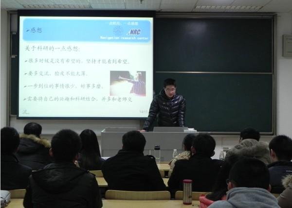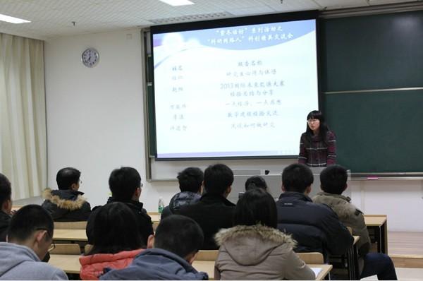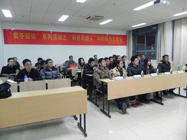 2013年12月10日晚6:30,由kok体育 研究生会主办的“紫冬话坊”系列活动之“科研同路人”科创精英交流会活动在A18楼218教室顺利举行。本次活动邀请到我院硕士研究生任仁、李洁、万骏炜、赵阳以及博士研究生许德智五位学术精英为到场同学们作报告,研究生辅导员刘斐文老师也莅临现场出席了本次活动。