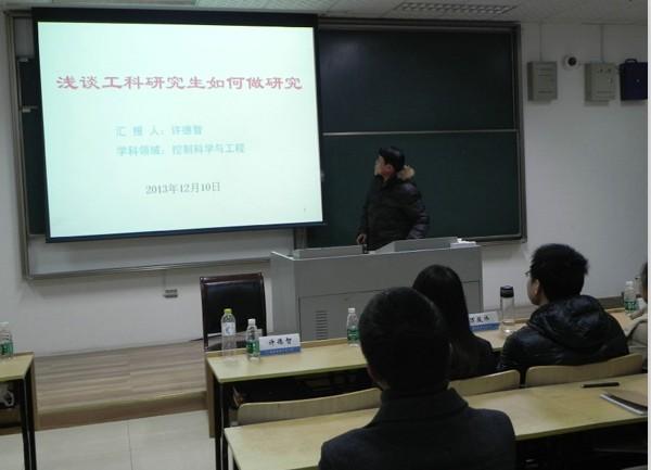 首先为现场同学进行讲座的任仁同学结合自己的科研经历,将自己的经验总结为“三个笔记本”(实验记录本、文献记录本、新想法记录本)以及“三个D”(Discussion、 Debugging 、Discover),他认为科研成功的关键在于记录点滴和抓住想法。紧接着做报告的是李洁同学,李洁同学有着丰富的数学建模经验,她结合自身经历讲解了有关数学建模的一些问题并号召大家一起去了解数学建模的神奇,在培养自己的数学思维、学会创新的同时也锻炼自己自学的能力和解决问题的能力。随后出场是我院刚刚获得校“天宫杯”研究生创新实验竞赛二等奖的万骏炜同学,他回顾了自己自研究生一年级以来的科研历程,并结合自己参加“天宫杯”研究生创新实验竞赛的感想,告诉大家做科研最重要的就是“相信自己,永不言弃”。接下来报告的是赵阳同学,赵阳同学虽然只是研究生一年级的同学,但已经有过参加国际能源大赛的经历。赵阳同学表示,这次参加国际大赛的经历让她深刻体会到机会来之不易,遇到机会就要牢牢抓住。最后作报告的许德智博士有着丰富的科研经验,他以师兄的身份从如何阅读文献、怎样选题和如何做研究三个方面为现场同学提出了一些建议。许博士的报告内容细致而实用,提出的问题也很有针对性,现场同学都备受启发。