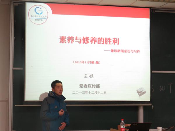 12月12日,kok体育 第十三期S.W.T.工作坊之新闻采访与写作在将军路校区举行。本期工作坊由南航报编辑部主任王超担任主讲,院团委书记季娟作为嘉宾出席了本次活动。参加本期工作坊的还有2012、2013级的学生骨干。 在对南航kok体育进行简要介绍后,王超从政治家办报、历史家办报、新闻家办报3个话题引入对新闻工作价值观的探讨,强调好的新闻采写缘于正确的新闻价值观的确立,并简要阐述了“什么是新闻”“新闻基本特征”等基础新闻理论观点。在新闻采访业务指导环节,他指出,“七分跑,三分写”是新闻记者的重要素养,并引用20世纪初著名记者黄远生的“四能说”,阐述新闻记者应着重培养的四种新闻采写技能。针对同学们的具体采写需求,王超重点讲解了“消息”的写作要领,并以丰富的实例向同学们做了详细阐述。 在互动环节中,王超对活动现场同学提供的近期3篇新闻稿进行了点评和修改,并对同学提出的问题进行了一一解答。 培训最后,王超与大家共勉道:“我们都是南航的新闻工作者,讲述南航‘好’故事,传播南航‘好’声音是我们共同努力的方向”。