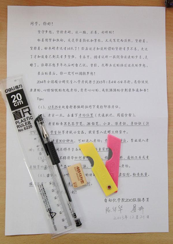 在信笺的反面,学院院长姜斌教授祝所有考研学子在这次考试中可以乘风破浪,披荆斩棘,取得优异成绩。党委书记王勤教授希望所有认真考研的同学坚持,坚持,再坚持;认真,细心应对,考出好成绩,实现深造梦想。在短短的几句话中,透露出学院领导对2010级同学的深切关怀。